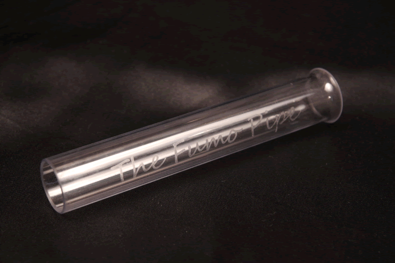 Text on tube reads, "The Fumo Pipe". This text can be customized! Made from indestructable polycarbonate. This tube has a flared end for your comfort and ease of use.